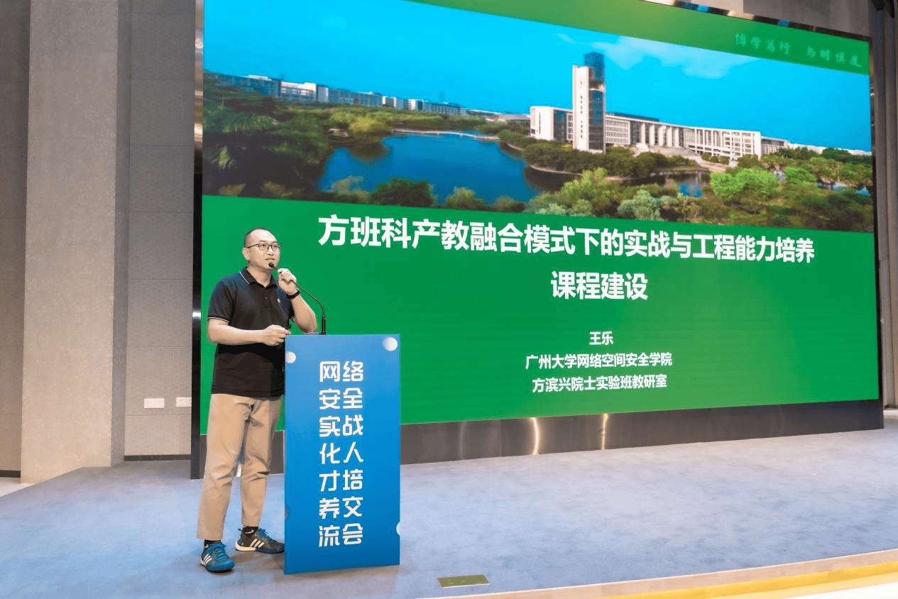 广州大学网络空间安全学院副院长王乐介绍了独具特色的“方班科产教融合模式”,通过假期营、演武堂等创新形式,构建了突出实战与工程能力培养的课程体系,提供了应用型人才培养的成功范例。